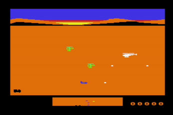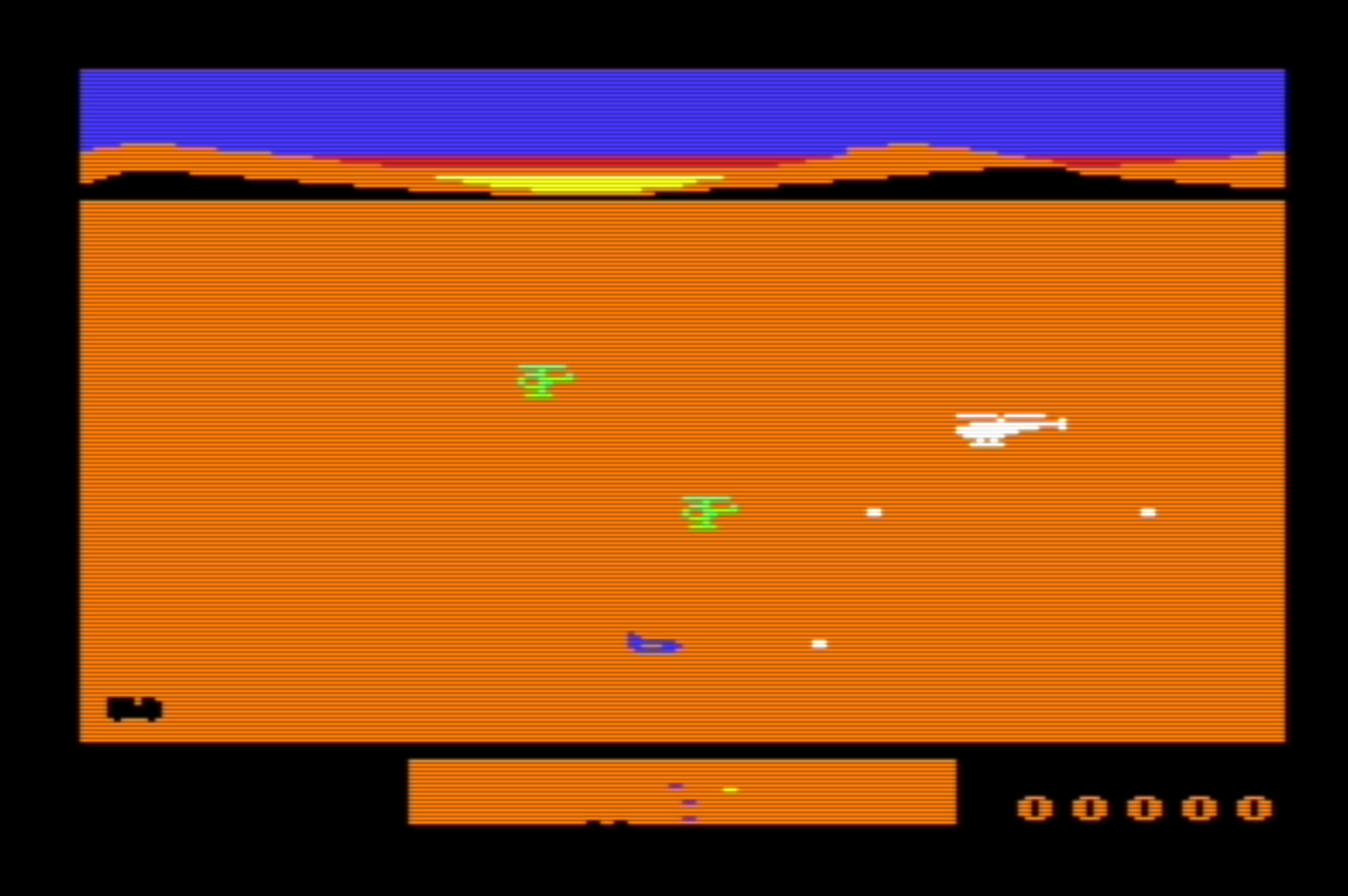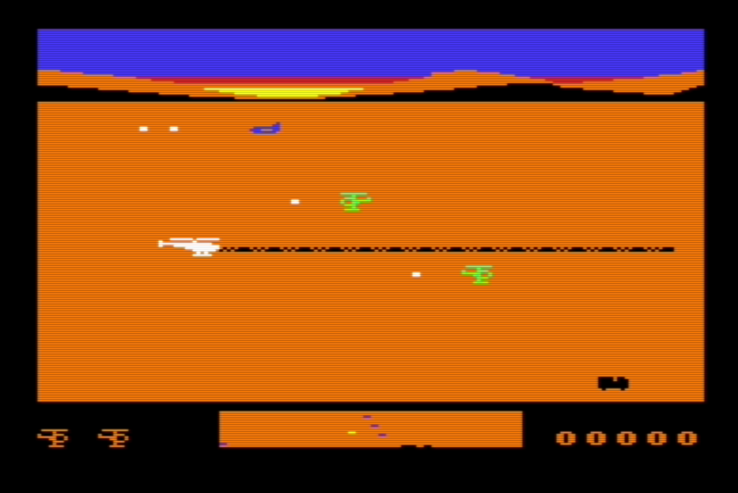 This is a shooter for Commodore VIC-20 with vertical scrolling. Fly your attack helicopter to guard the truck transports. Use joystick. Press any hold the button for autfire. Keep an eye on the radar at the bottom of the screen to be prepared for upcoming enemies.